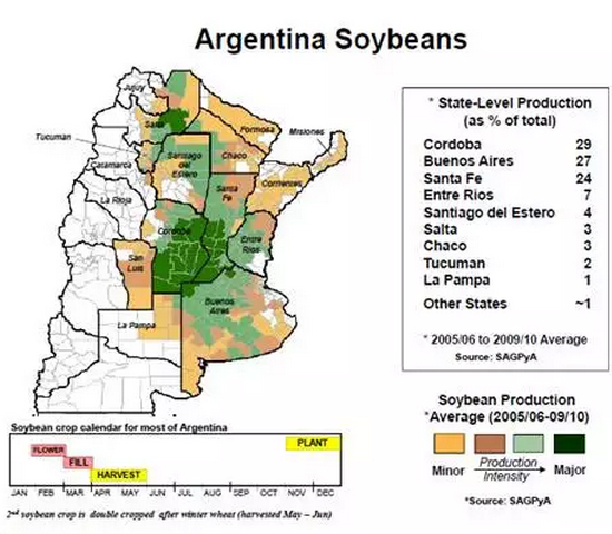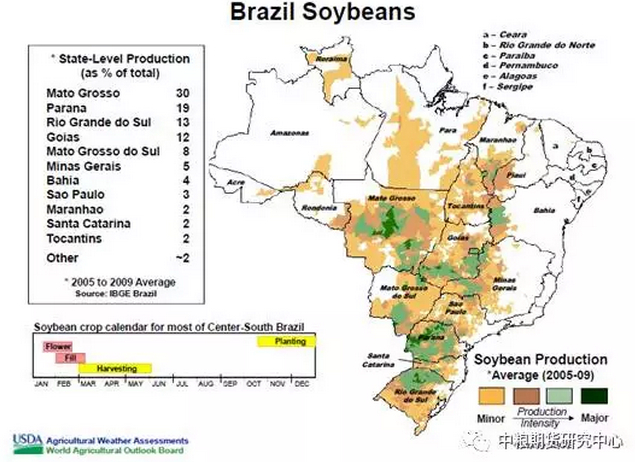 首先,就大豆播种面积而言,美国、巴西、阿根廷大豆的主产区不同,播种时间不一,但是年复一年,主产区、播种时间的变化不大,长期而言可能存在一些变化趋势,例如巴西大豆播种时间,近几年随着种子、灌溉技术改进而有所提前。下面三张图分别展示了美国、巴西、阿根廷大豆的主产区分布以及播种时间。