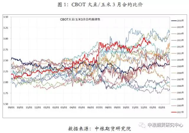 大豆的主要竞争作物是玉米,在美国,大豆、玉米的主产区同分布在中西部地区,播种时间上,玉米略早于大豆,因而二者存在很强的竞争关系(但不是说存在很强的此消彼长的关系)。大豆玉米的种植收益偏离均值区域较远时,农民可能会放弃播种习惯而该种效益好的作物。下图是CBOT大豆/玉米比价,均值区域在2.2附近,目前以3月合约为标的,可以看到大豆/玉米处于较高的位置,大豆价格更有吸引力。