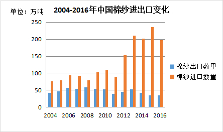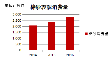 海关数据显示,2016年中国棉纱进口约197.2万吨,出口约35.6万吨,棉纱净进口月162万吨。结合2016年2610万吨的纱线产量,2016年中国棉纱表观消费(产量+净进口量)约2772万吨。