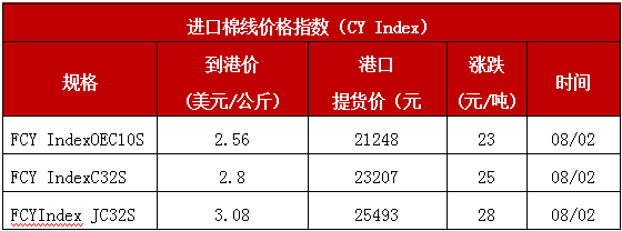 进口棉纱价格指数主要反映发布当日的国内进口棉纱C21S、C32S和JC32S的综合价格水平。该指数是以国内外棉纱厂家办事处、贸易商、代理商的棉纱CNF报价为计算基础,经加权校准,最终得以产生(以“美元/公斤”计价,美元折人民币港口提货价包含关税、增值税和港口费用)。