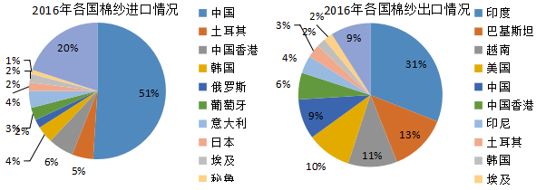 从贸易流向的角度观测,中国是棉纱进口大国,2016年占全球棉纱进口总额的比重约51%。印度是棉纱的出口大国,2015年占全球棉纱出口总额的比重约31%,其次分别是巴基斯塔、越南和美国。