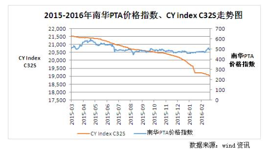 比较2015年3月至2016年3月CYIndexC32S与南华PTA价格指数,可发现CY Index C32S与南华PTA价格指数正相关性达到0.69,因此,研究棉纱价格的同时也需关注PTA的价格。