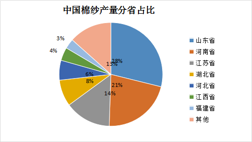 根据中国统计局数据显示,我国主要棉纱产地集中位于华东及华北地区。棉纱产量前三甲分别为山东、河南和江苏,合计占比约63%。