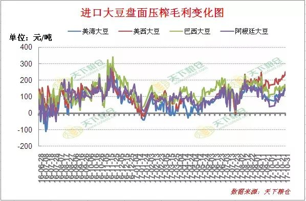在此背景下,10月中旬以后进口大豆盘面榨利回升,并暂时扭转此前榨利下滑态势,如下图4所示,截止周二美湾大豆盘面压榨毛利已提高至151元/吨,较10月中旬初100元/吨增加51元,美西大豆盘面压榨毛利已提高至250元/吨,较10月中旬初的190元/吨上涨了60元,巴西大豆盘面压榨毛利已提高至151元/吨,较10月中旬初上涨21元,阿根廷大豆盘面压榨毛利已提高至140元/吨,较10月中旬初增加了80元。正是在压榨利润回升刺激油厂增加大豆采购,未来数月进口大豆到港量庞大,据Cofeed调查数据显示,11月大豆到港最新预期在880万吨,12月份最新预期在930万吨,明年1月最新预期在800万吨,即11-1月合计高达2610万吨,这也高于10月中旬初预估值的2570万吨。
