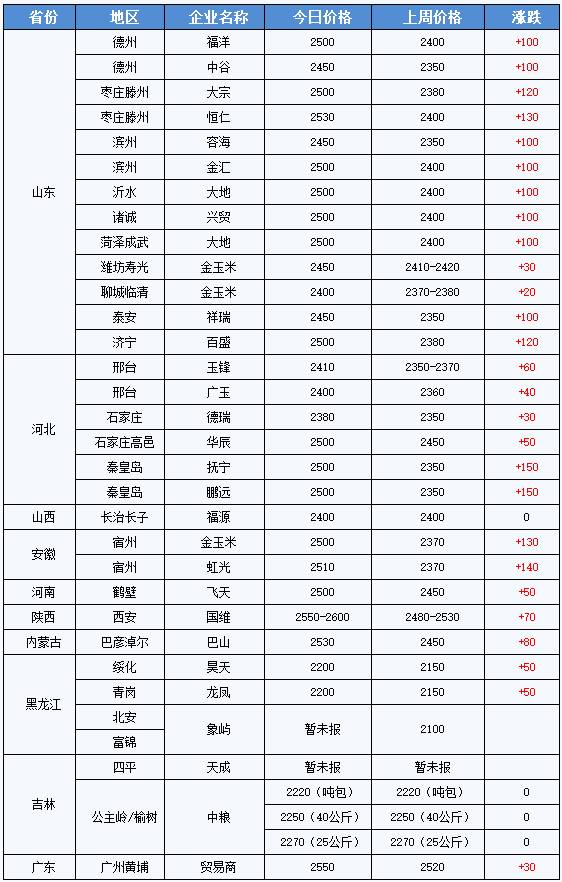 此外,据天下粮仓调查数据显示,当前淀粉企业库存使用天数在5-6天左右,处于偏低位,加之近期朋友圈被一则“京津冀及周边地区秋冬季大气污染综合治理攻坚行动方案”霸屏,据说11月15日起华北环保检查可能从严,市场仍有担忧情绪,销区客户加紧备货,导致近期淀粉签单较好,据悉当前大部分企业淀粉货源已经签售完,上周山东地区某大型企业三天已签售4-5万吨淀粉,厂家仍有不少合同待执行,实际可售货源不多,货源紧张,厂家纷纷提价,今日山东地区厂家是多次提价,目前已突破2500元/吨大关。