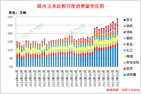 直至去年秋季,国内玉米价格进一步大幅下调,导致玉米淀粉价格走低,在低价玉米淀粉刺激下,已经开始催生一些新的市场需求,据淀粉工业协会数据显示,2017年1-9月淀粉中的饲料需求量在33万吨,预计2017年全国在饲料需求量或达40万左右。