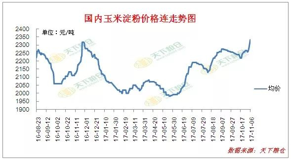 在新季玉米大量上市之际,毫无疑问的普遍认为玉米淀粉价格势必将跟随成本价格下行波动。但近期玉米淀粉走势与市场预期恰恰相反,全国玉米淀粉价格却持续开启上涨模式。据天下粮仓调查显示,截止11月6日,山东、河北地区玉米淀粉市场主流报价在2380-2500元/吨,较上周纷纷大涨30-150元/吨,山东地区普遍涨100元/吨;东北地区玉米淀粉市场地销主流价格在2200-2270元/吨,较上周涨50元/吨,创今年以来新高,但由于涨势较猛,市场追高谨慎,据悉今日大涨后成交不活跃。