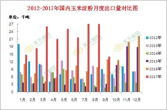 附图:2012-2017年国内玉米淀粉月度出口量对比图