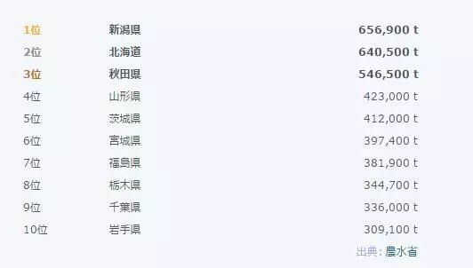 的确,按照日本农林省公布的2014年的产量统计,大米产量位居第一的就是新潟县,依次是北海道、秋田县、山形县、茨城县、宫城县、福岛县、栃木县、千叶县、青森县。