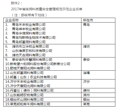 2017年,青岛、德州、临沂、聊城等10个市共申报省级规范示范企业44家,截止到2018年2月份,省局已经选派专家组对7个市申报的27家企业进行了检查验收,共有济宁天普阳光饲料有限公司等19家饲料生产企业评分在85分以上,现公布为省级《饲料质量安全管理规范》示范企业(附件2),有效期3年。