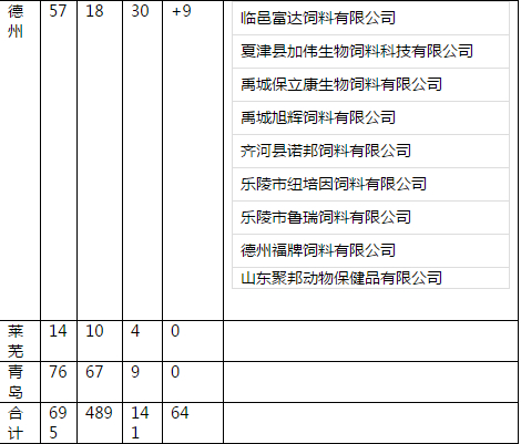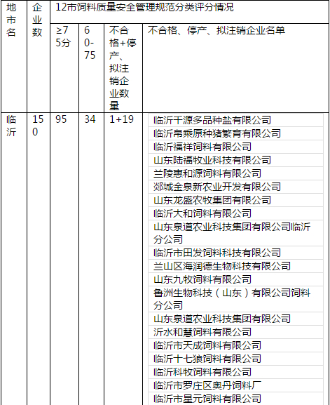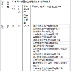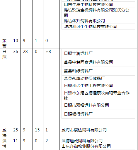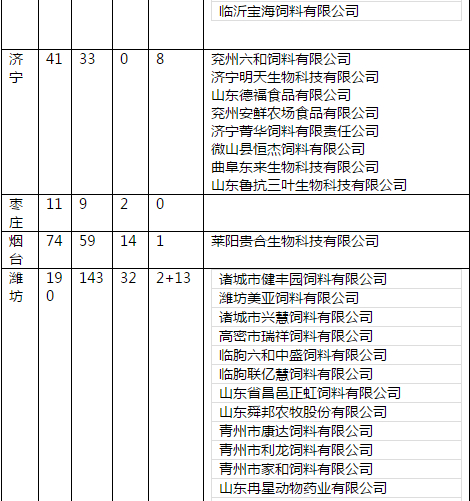 各市高度重视,迅速行动,陆续开展了培训观摩、检查验收活动,全省1100余家配合料、预混料生产企业积极响应和配合。截止到2017年底,临沂、东营、济宁、日照、潍坊、烟台、威海、淄博、枣庄、青岛、德州、莱芜12个市完成对辖区内695家配合料、预混料生产企业的《山东省饲料质量安全管理规范现场审核表》现场检查,现将检查结果予以通报(附件1)。滨州、聊城等市评定工作正在进行中。