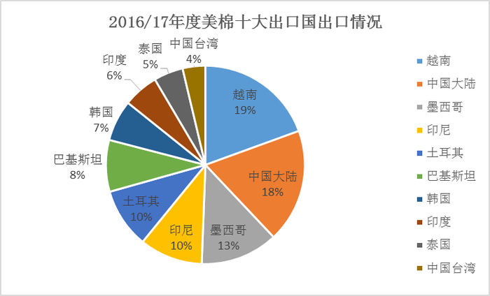与我国截然相反的是,美国棉花主要以出口为主。由上图可以看出,近5年来,美国棉花出口量占其总产量的65%以上,本国的消费量十分有限。最新数据显示,2017/18年度,美国棉花总产量预估457万吨,出口量预计322.6万吨,占年产量的70.59%。而在其出口市场中,越南、中国及墨西哥为主要输出国,如下图所示: