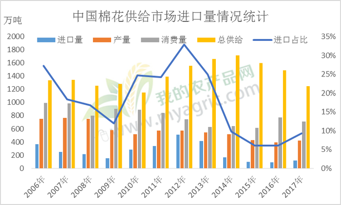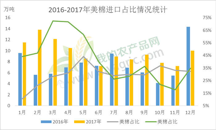 一直以来,我国棉花市场处于产不足需的状态,需要进口一定数量的棉花满足需求缺口,但随着近年来国家对棉花市场的调控,对进口棉的依赖度逐渐减小。由上图可以看出,我国棉花进口量高峰期在2010-2013年,2014年以后进口量快速下滑。2017年,年我国棉花总供给量(含期末库存)1245.4万吨,总需求量711.5万吨,棉花进口量115.3万吨,而美棉进口数量仅有50.54万吨,占我国需求量的7.1%,占总供给量的4.1%。