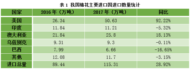 与此同时,美棉向中国输出的棉花总量也在不断增加。同比来看,2017年我国棉花进口总量增加25.87万吨,涨幅28.92%,其中主要进口增长来源于美国。由上表可以看出,2017年我国共计进口美棉50.63万吨,进口总量较2016年几乎增加了一倍,这主要源于2017年上半年国内棉花强劲的需求。而其它进口国如印度、澳大利亚等进口量基本波动不大。