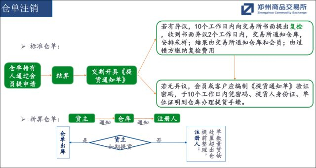 仓单出库:复检结果不符合出库规定的,在双方约定或者规定的出库时间内,仓库或者标准仓单转让人可以用符合出库规定的商品调换,提货方不得拒收。商品调换不得影响商品及时出库,调换增加的运输、检验等费用由仓库或者标准仓单转让人承担。调换后商品的仍不合格,仓库或者标准仓单转让人可以与客户(提货方)协商处理。