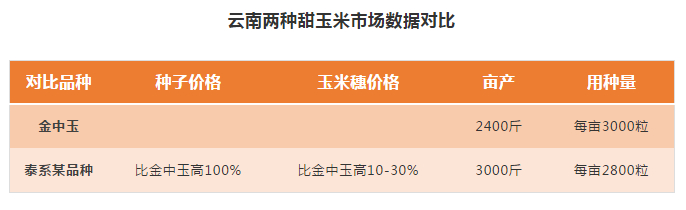 然而,在其他销售区域,泰系品种的影响力还没有形成。“泰系品种穗型偏大,在上海、武汉、长沙占有率较低。”全波说。泰系品种与华珍还有另一个巧合,是在国内的推广路径惊人一致。据知情者透露,目前泰系品种在国内种植面积排行前四分别为:广东惠州、广东徐闻、广西横县和海南东方。据中国鲜食玉米流通行业联盟云南分会会长黄先驰说,目前,泰系品种在云南纯黄甜玉米市场中的份额还不高。他认为,主要原因是该类种子价格较高,云南甜玉米种植户暂时接受不了,还需要一段时间的市场培育。