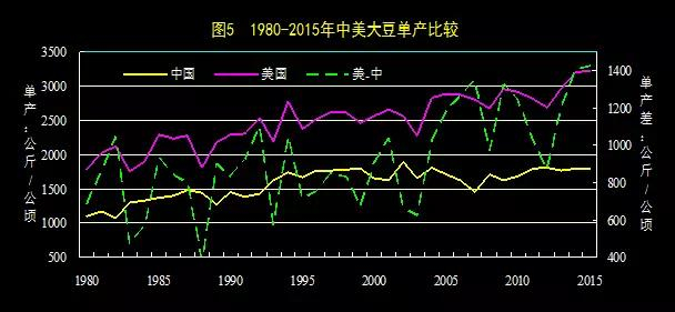 另外在产量方面,美国的转基因大豆产量长期以来要比中国的非转基因大豆高,以2015年的数据来看的话,美国大豆产量是每公顷3227公斤,而中国是每公顷1800公斤,高出了中国将近80%。