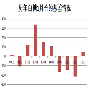 1、白糖期货合约1月历史基差情况。首先来看下白糖期货1月合约的历史基差情况,如下所示