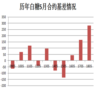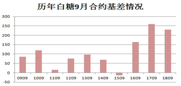 总体上看,历年白糖合约基差出现三个显著的特点,第一是1月白糖合约基差现货基本平水交割,第二是9月合约基差趋向升水的概率几乎接近百分百,第三近三个年度白糖合约基差绝对值出现大幅度的扩张并且远高于往年周期。