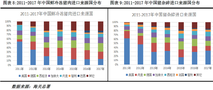 分种类来看,2017年我国鲜冷冻猪肉的5大进口国为西班牙、德国、加拿大、美国和丹麦,这五国鲜冷冻猪肉进口量共占71.5%,为87万吨,我国猪杂碎的五大进口国为美国、德国、丹麦、西班牙和加拿大,这五国进口量共占77.1%,为98.9万吨,其中自德国进口的鲜冷冻猪肉和猪杂碎增长速度较快,从2011-2017年德国进口鲜冷冻猪肉和猪杂碎分别占比5.3%和3%上升到17.4%和11.8%,在2015年最高达到26.4%和19.8%。