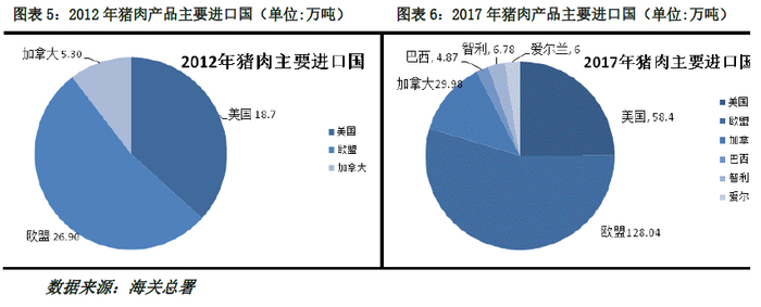 2012年以来德国、西班牙、美国、丹麦、加拿大一直是我国猪肉产品主要进口国,其总进口量占比从2012年的88.9%下降到2017年的75.12%,2017年我国自欧盟进口猪肉产品128.04万吨,与2012年相比,年平均增长率36.62%,占同期我国进口总量的51.4%,同年自美国进口58.4万吨,与2012年相比年平均增长率25.58%,占同期我国进口总量35.7%。此外自加拿大进口29.98万吨,与2012年相比年平均增长率41.42%,在此期间,随着国内猪肉市场进一步的开放,巴西、智利、爱尔兰等国家也逐渐进入到中国猪肉市场。