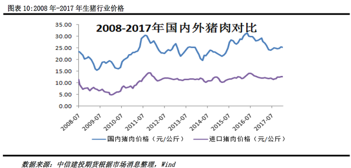 (一)、中国猪肉产品进口逻辑。我国从国外进口的鲜冷冻猪肉和猪杂碎并不直接与市面上的生鲜猪肉形成竞争,基本上以供应食品加工业为主,此类猪肉产品的进口直接推动原因是价格相对国内同类产品更低,而根本原因是国内猪肉及冻肉产品在供给上的波动性给出的市场缺口。(1)国内外生猪产品价格差是猪肉产品进口的直接原因。发达国家饲料价格风险控制较好、育种养殖技术有优势,猪肉的价格波动较为平稳。2008-2017年进口猪肉价格一直保持在10-15元/公斤的范围,而国内受猪周期影响猪肉价格的波动较大,从2008年到2017年期间最高达到30元/公斤,最低仅为15元/公斤。国内外近一倍的猪肉价差让国内猪肉深加工企业看到了巨大的利润以及更为稳定的成本,以2018年1月份猪肉价格为例,国内猪肉价格为25.35元/公斤,进口猪肉价格为12.69元/公斤,对进口贸易商而言,进口猪肉进入中国的成本一直大致是固定的,大约是6%的关税、13%的增值税以及不到5%的运费,折算成最终的销售价格为15.96元/公斤。与国内猪肉价格相比,近10元/公斤的价差让猪肉深加工企业心动不已,双汇发展就在2015年进口了近21亿的美国猪肉来降低企业成本。