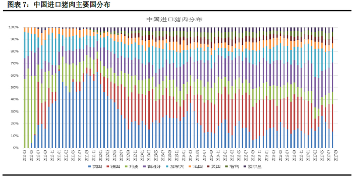 在研究生猪行业时,我们常常忽略国外进口的生猪产品,一方面我国进口量较少,进口生猪产品仅占总体供应量的2.6%左右,另一方面国外进口生猪制品主要为冻肉和猪杂碎,与国内销售的鲜肉并不存在直接竞争。此外,养殖行业向来在销售半径上有所限制,一方面饲料原料的运输较生鲜品的运输在成本上有一定优势,另一方面跨国和跨区域的生鲜品运输中对于检验检疫等有着相对严格的要求。尽管如此,我们认为随着国内饲料成本逐步上升,内外养殖成本差距有扩大的趋势。在此情况下了解生猪产品进口的情况和趋势对于国内生猪市场研究具有重大意义。