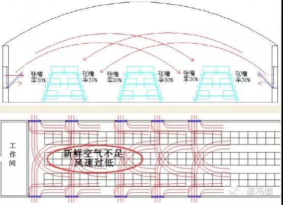 进风量与排风量相匹配。进风口风速与负压、小窗、鸡舍横截面积等因素相关,决定风从哪里进入鸡舍,风的流向和速度很重要。