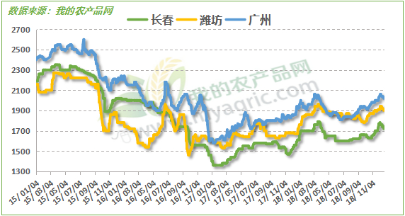 第一阶段,2017年12月-2018年3月。2017年是玉米供给侧改革第二年,玉米种植面积继续下降,同时因玉米临储拍卖成交5740万吨,导致市场相信产需缺口的存在。自2017年10月份开始,2017年产玉米上市供应市场,饲料及深加工企业加速在产区收粮,扩大囤粮规模。加之华北产区因收获期连续的阴雨天气,导致华北玉米霉变普遍高,华北加工企业北上抢粮。至此,东北玉米供应全国,玉米价格快速上涨。