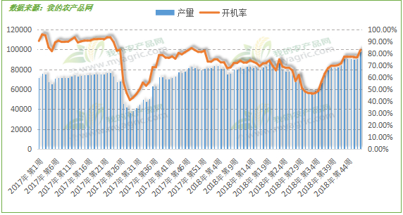 今年全国67家玉米淀粉企业平均开机率76.3%,2017年为77.3%,较去年同比增长2.7%,波动幅度不大。除春节放假期间淀粉企业大面积停机导致开机率骤降外,2018年整年度淀粉开机率平稳运行。2017年玉米淀粉企业开机时常受到环保影响,而进入2018年,淀粉企业环保资质已陆续达到政府规定,环保影响力度削弱,开机率波动幅度较小。全年玉米需求较为平稳,无太大波动幅度。预计明年也将维持一个平稳运行态势。