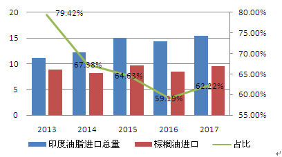 图 印度油脂进口总量及棕榈油占比(单位:左百万吨,右%)