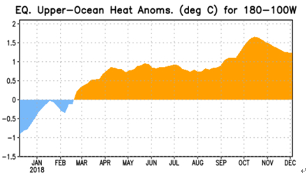 太平洋海温异常指数,自2018年3月中旬开始达到0.5℃以后,到9月中旬已达5个月之久,意味着厄尔尼诺已然形成,但此后海温异常指数依然维持在0.5℃之上,中旬最高达到了1.6℃左右,到了12月海温维持在1.2℃附近,若一直持续且继续上升至2℃之上,则可能会出现偏强厄尔尼诺,但就目前海温异常指数来看,中性厄尔尼诺的概率较大。