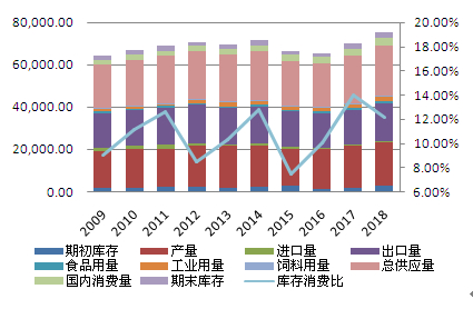 由于2018年全年棕榈油价格的持续下跌,国内棕榈油采购目前是相对谨慎的。2015年融资规模下降, 2016年因减产套盘进口, 2017年产量恢复,2018年进口增加,目前国内库存维持在40万吨水平,截止12月下旬马来西亚进口到港成本价为4378.97元/吨,较年中下跌780元/吨,较年初下滑了1075元/吨;国内广州棕榈油现货价格为4100元/吨,较年中下跌740元/吨,较年初下滑了1110元/吨;因此内外价差为243元/吨,较年中缩窄了40元/吨,但较年初扩大了35元/吨。由于今年的中美贸易争端对国内棕榈油几乎没有什么影响,因此贸易商的进口节奏始终也维持在相对平稳的水平,马棕油和连棕油价格全年低位运行,并未出现像样的大级别反弹,因此今年全年国内现货与马来的内外倒挂波幅趋窄,价差并未出现大幅波动,全年的震荡区间基本在-150~-250元/吨,处于较平均的水平。预计明年棕榈油价格维持底部走势,国内贸易商的进口依然较为谨慎,而在国内外棕榈油倒挂较为稳定,难以刺激国内的需求,预计2018/19年中国棕榈油进口增幅有限,且印尼不断降低出口关税以刺激消费的前提下,我国预计会增加印尼的进口量。