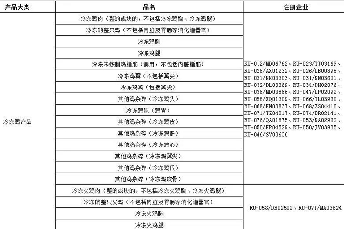 2、新增俄罗斯23家输华冷冻禽肉企业自2019年1月30日及以后生产的符合中国要求的冷冻鸡肉、冷冻火鸡肉产品输华。