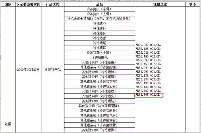 1、恢复法国FR.64.305.002CE企业自2019年1月30日起及以后生产的符合中国要求的冷冻猪肉产品输华。