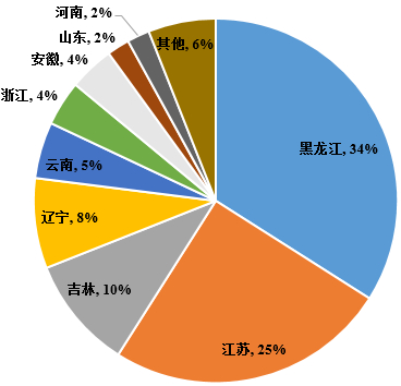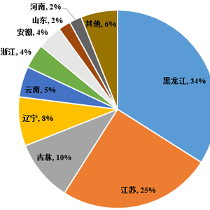 2018年我国粳米产量约4700万吨,约占全球粳米总产量的68%。我国有24个省区种植粳稻,包括东北三省、江苏、浙江、云南和安徽,总种植面积在910万公顷左右,其中2/3在北方,东北地区种植面积在320万公顷左右,占北方粳稻面积的60%左右。东北粳稻一季种植,生长期长,昼夜温差大,养分积累好,晶莹洁白,食味好,在品质上一般优于苏皖浙粳米,近些年黑龙江地区产量比重逐渐上升,江苏地区产量下降,截至目前黑龙江比重由原先不足15%上升至35%,而江苏地区则由35%下降至25%附近。