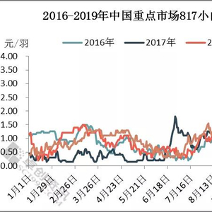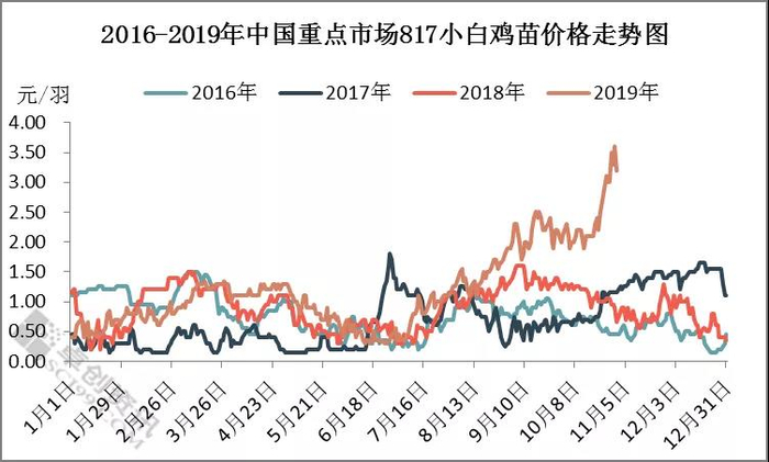 从图中可以看出, 2019年上半年817小白鸡苗价格与往年大致持平,但进入下半年鸡苗价格持续上涨,突破历史高位。统观近4年817小白鸡苗价格进行比较,2017年鸡苗价格相对最低,2019年价格相对最高。据卓创资讯统计,2019年1-10月817小白鸡苗均价1.19元/羽,同比走高0.27元/羽,涨幅29.35%。一季度817小白鸡苗价格呈震荡走高趋势,鸡苗均价0.85元/羽价格,由0.40元/羽上涨至1.00元/羽。春节后,由于屠宰企业陆续开工,毛鸡行情尚可,春暖花开养殖户补栏积极性有所提高,所以817小白鸡苗价格开始逐步走高。