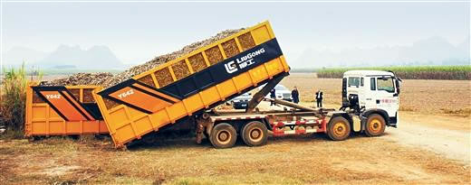 同属崇左市的扶绥县,驰骋蔗海多年的“切段式”收获机增加了新伙伴——一种类似集装箱的无盖周转箱。机收的切段蔗直接在地头装进周转箱,拖车头自动钩拉上去运往糖厂。