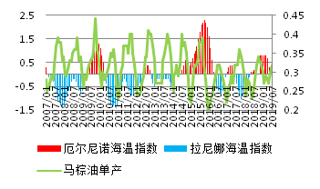 图5:ENSO指数与马来西亚棕油单产对比(单位:左℃,右吨/公顷)