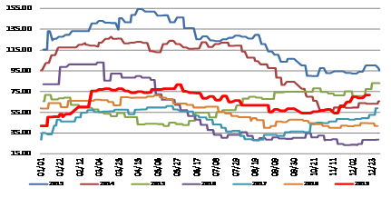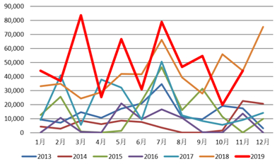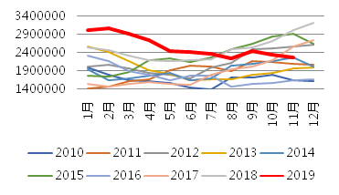 回顾2019年国内外棕榈油的走势,从跌跌不休到上涨到光芒万丈,反应的是资金对油脂信心的大幅转变。马棕油1月份初当时正是“春风得意”,由于季节性减产加上期价的技术性反弹,期价从2132上涨逾200点至2月上旬的2344一线,其后由于市场预估马来1月产量下滑幅度一般,库存创下近十年的高点,期价一路下滑至3月中旬的2038附近,在此期间无论是马来出台的零税率政策,还是出口增加的利好,终究抵不过产量反弹带来的库存增加担忧。其后期价超跌反弹至4月上旬的2235附近后再度遭空头棒杀,期价一路跌至7月上旬的1916,跌幅接近15%,也充分释放了市场对未来的悲观情绪。