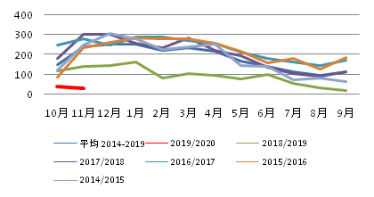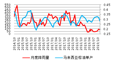 自2018至2019年春季的中性厄尔尼诺在上半年并未给印尼马来带去持续的干旱影响,但三季度以来马来和印尼的降水偏少的确是对产地的油棕果产量构成了一定的减产担忧。马来西亚2019年全年降水量,较近六年的均值少很多,并较2015/16年度更少,且从三季度以来表现的相当明显。印尼的情况跟马来很相似,从印尼全国整个11月的降水来看,六年平均为8.07mm,2015/16年度也有7.81mm,而今年只有1.06mm,降水的匮乏对油棕果的减产影响从目前来看是不可逆转的。