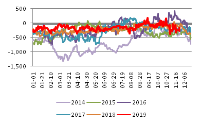图1:马棕油指数期价2019走势(单位:林吉特/吨)