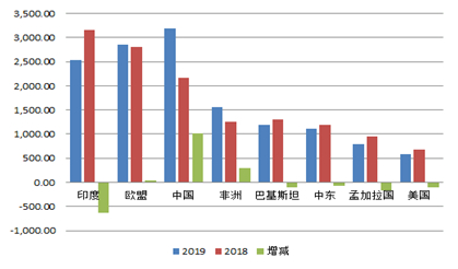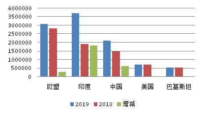 图15:2019年1~10月全球主要国家棕榈油进口量自马来西亚(单位:吨)
