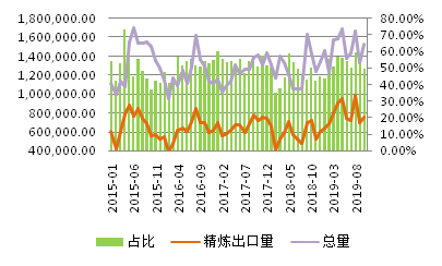 图14:2019年1~10月马来精炼棕油出口量及占比(单位:左吨,右%)