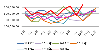 2019年1~10月份,我国进口棕榈油共579.02万吨,较去年的418.19万吨增加38.46%。其中从印尼进口总量为421.05万吨,同比增加81.5%;从马来西亚进口总量为170.39万吨,同比增加50.4%。2019年棕榈油进口大增主要原因除了非洲猪瘟导致的都有产出下滑,以及贸易关系反复,棕榈油大量进口以填补可能的缺口之外;第二就是无论是马来还是印尼,报价模式均为远月升水,因此在远月平水的时间节点,企业只要有利润空间就会大量采购。