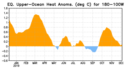 从短期太平洋海温异常指数来看,2019年3月以来太平洋海温异常指数达到最高的1.4℃后就开始缓慢下降,到了5月初已经回到0℃恢复的中性海温值了,然而到了九月中旬,指数却再度缓慢回升,10月初已经升至0.8℃附近,到了12月末再度回到0℃附近,虽然目前来看ENSO指数呈现中性状态,但仍有偏厄尔尼诺的趋势。