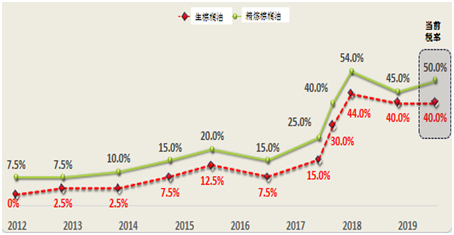 2019年由于印度政策引发的棕榈油行情为数不少。随着经济的增长,印度的油脂需求近年来大幅增加,而印度本国的油脂自给量很差,因印度本国的油籽单产很低,因此近三分之二的食用油需求依赖进口来满足。印度近两年一直通过鼓励国内农户提高产量来减少海外进口,因此从2018年开始就逐渐抬升植物油的进口税。对棕榈油的加税周期始于2017年8月,之后在2018年3月将毛棕榈油和精炼棕榈油的进口税从调整为44% & 54%,到了2019年1月税率下调至40%& 45%,但是到了9月开始精炼棕榈油加征5%的保护性税。