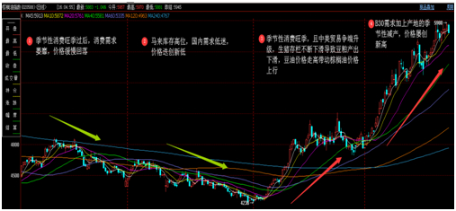 进入三季度的消费淡季,此前但技术上连续的下跌也让期价做空动能大大减弱,马棕油底部雏形初现。七月中旬后,马来MPOB数据显示库存下滑,加上印尼6月棕榈油产量增幅低于市场预期,此后伴随马来出口的不断增加,马来棕油价格持续反弹至8月下旬的2312,上涨了341点,涨幅达17.3%,随后欧盟和印尼双双出台抑制棕榈油进口的政策后,市场做多情绪有所减弱,价格开始高位回落至10月中旬。而马来出台了加大进口印度农产品消息以缓解两国贸易关系后,不久印尼的B30即将落地的消息随之而来,这一消息很快点燃了市场被压抑很久的做多热情,期价开始了猛烈的拉涨至12月中旬的2930,本轮涨幅达到36.9%,期间的马来西亚产量下滑高于预期,印尼因降雨减少而产量引发市场共给担忧等利好频出,铸就了本轮波澜壮阔的上涨行情。