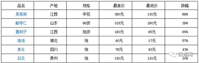 原标题:2019年价格跌幅六大品种:吴茱萸、麦冬… 来源:药通网——王一帆