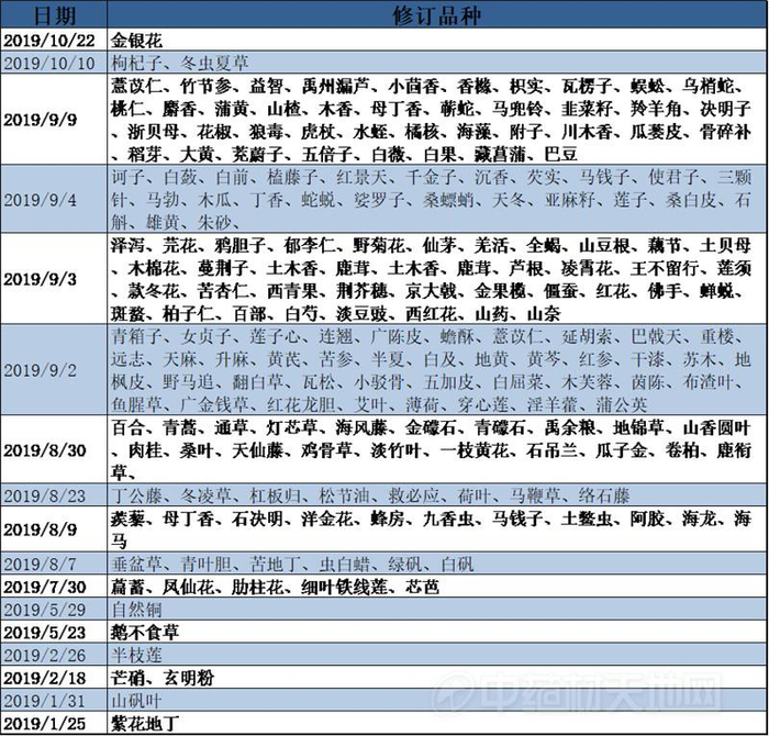 2019整年以来国家药典委员会为确保标准的科学性、合理性和适用性,网站不定时公布204个中药品种(包含炮制品总共218个)的国家药品标准将修订。对其药材及饮片的性状、鉴别、检查、含量测定、浸出物、炮制等各方面做了不同的修订。